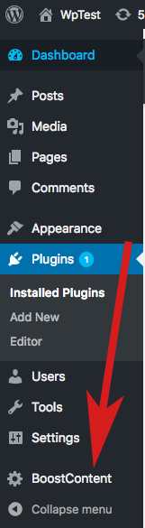 3. Click on the Boostcontent plugin settings in the wordpress admin menu